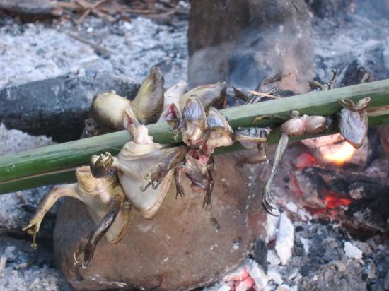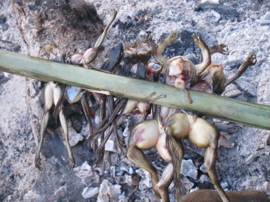 Les Cambodgiens aussi apprecient les grenouilles, mais entieres et grillees au feu de bois