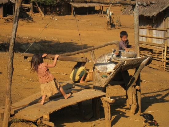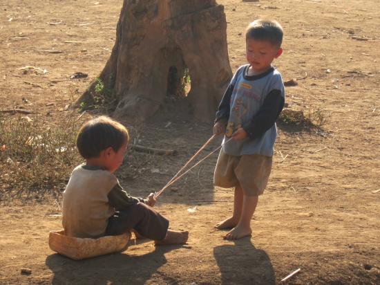 Enfants Hmong jouant à la luge sur terre