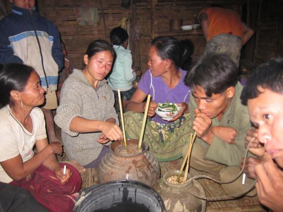 dégustation d'alcool de riz artisanal avec les villageois pour fêter l'achat d'un nouveau tracteur