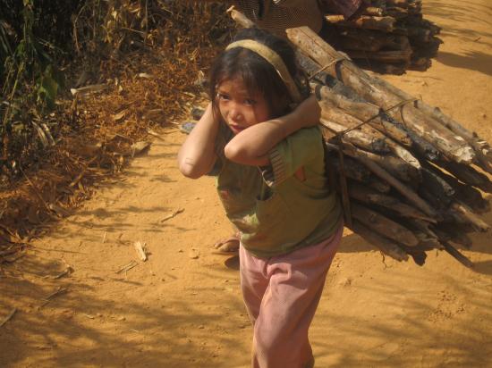 Petite fille d'une minorité laotienne qui porte le bois pour la cuisine sur plusieurs kms